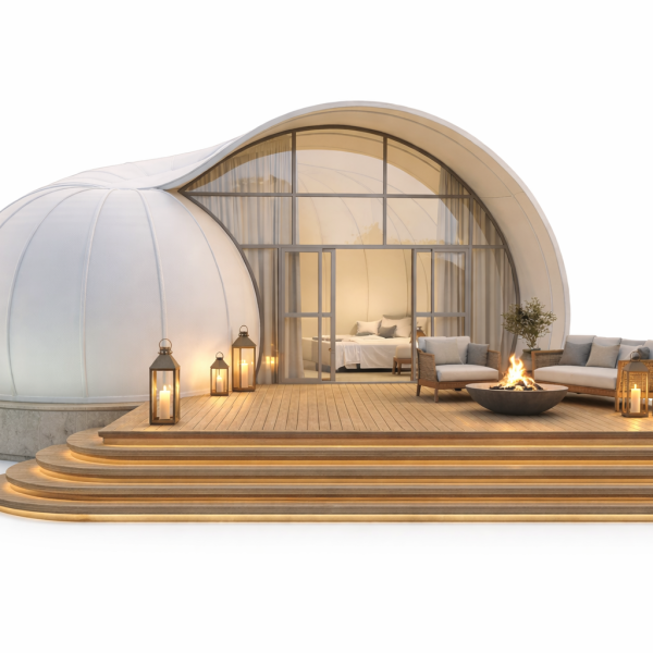 Dome Con Kén (Cocoon Dome) là dòng dome nghỉ dưỡng cao cấp với thiết kế bo tròn mềm mại, lấy cảm hứng từ hình dáng kén tằm tự nhiên. Kiến trúc độc đáo này mang lại cảm giác thư giãn, riêng tư và gần gũi với thiên nhiên, rất phù hợp cho các mô hình glamping và resort cao cấp.
