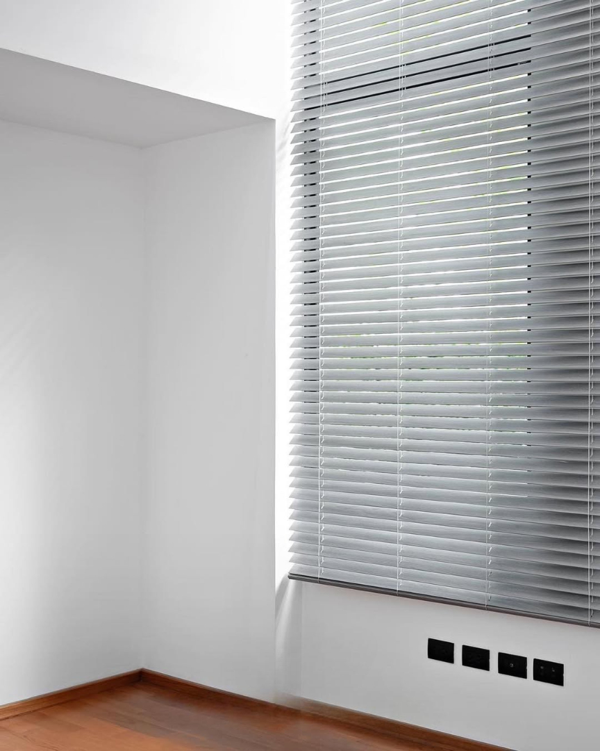 Rèm sáo nhôm vốn nổi bật bởi bề mặt lá nhôm mỏng, nhẹ, xếp đều tăm tắp tạo cảm giác hiện đại và sáng thoáng. Khi được nâng cấp bằng động cơ tự động, tổng thể càng trở nên sang trọng và liền mạch hơn.